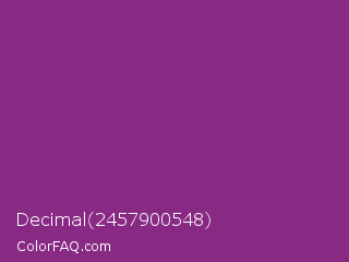Decimal 2457900548 Color is a normal magenta color and the nearest color is Razzmic Berry Crayola #843179. Hex code #882984 and RGB value is rgb(136,41,132). In RGB color space, this color is composed of 53% red, 16% green, 52% blue, In CMYK color space, this color is composed of 0% cyan, 70% magenta, 3% yellow , 47% black , In HSL color space, this color has a hue angle of 303° , 54% saturation and 35% lightness.