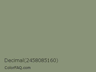 Decimal 2458085160 Color is a normal green color and the nearest color is Artichoke #8f9779. Hex code #889378 and RGB value is rgb(136,147,120). In RGB color space, this color is composed of 53% red, 58% green, 47% blue, In CMYK color space, this color is composed of 7% cyan, 0% magenta, 18% yellow , 42% black , In HSL color space, this color has a hue angle of 84° , 11% saturation and 52% lightness.