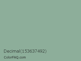 Decimal 153637492 Color is a light green color and the nearest color is Morning Blue #8da399. Hex code #8dae9a and RGB value is rgb(141,174,154). In RGB color space, this color is composed of 55% red, 68% green, 60% blue, In CMYK color space, this color is composed of 19% cyan, 0% magenta, 11% yellow , 32% black , In HSL color space, this color has a hue angle of 144° , 17% saturation and 62% lightness.
