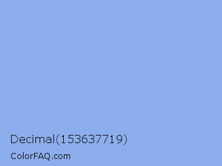 Decimal 153637719 Color is a light blue color and the nearest color is Jordy Blue #8ab9f1. Hex code #8daeed and RGB value is rgb(141,174,237). In RGB color space, this color is composed of 55% red, 68% green, 93% blue, In CMYK color space, this color is composed of 41% cyan, 27% magenta, 0% yellow , 7% black , In HSL color space, this color has a hue angle of 219° , 73% saturation and 74% lightness.