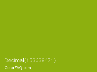 Decimal 153638471 Color is a normal lime color and the nearest color is Apple Green #8db600. Hex code #8db00f and RGB value is rgb(141,176,15). In RGB color space, this color is composed of 55% red, 69% green, 6% blue, In CMYK color space, this color is composed of 20% cyan, 0% magenta, 91% yellow , 31% black , In HSL color space, this color has a hue angle of 73° , 84% saturation and 37% lightness.