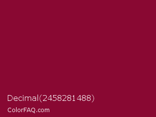 Decimal 2458281488 Color is a dark rose color and the nearest color is Paprika #8d0226. Hex code #890832 and RGB value is rgb(137,8,50). In RGB color space, this color is composed of 54% red, 3% green, 20% blue, In CMYK color space, this color is composed of 0% cyan, 94% magenta, 64% yellow , 46% black , In HSL color space, this color has a hue angle of 340° , 89% saturation and 28% lightness.