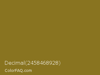 Decimal 2458468928 Color is a normal yellow color and the nearest color is Sand Dune #967117. Hex code #897420 and RGB value is rgb(137,116,32). In RGB color space, this color is composed of 54% red, 45% green, 13% blue, In CMYK color space, this color is composed of 0% cyan, 15% magenta, 77% yellow , 46% black , In HSL color space, this color has a hue angle of 48° , 62% saturation and 33% lightness.