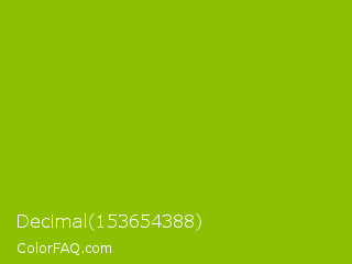 Decimal 153654388 Color is a normal lime color and the nearest color is Apple Green #8db600. Hex code #8dbf02 and RGB value is rgb(141,191,2). In RGB color space, this color is composed of 55% red, 75% green, 1% blue, In CMYK color space, this color is composed of 26% cyan, 0% magenta, 99% yellow , 25% black , In HSL color space, this color has a hue angle of 76° , 98% saturation and 38% lightness.