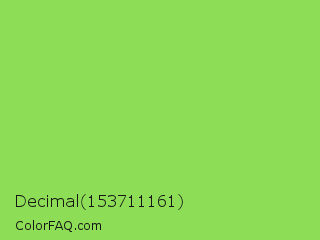 Decimal 153711161 Color is a normal green color and the nearest color is Kiwi #8ee53f. Hex code #8ddd57 and RGB value is rgb(141,221,87). In RGB color space, this color is composed of 55% red, 87% green, 34% blue, In CMYK color space, this color is composed of 36% cyan, 0% magenta, 61% yellow , 13% black , In HSL color space, this color has a hue angle of 96° , 66% saturation and 60% lightness.