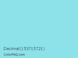 Decimal 153715721 Color is a light cyan color and the nearest color is Medium Sky Blue #80daeb. Hex code #8de1e9 and RGB value is rgb(141,225,233). In RGB color space, this color is composed of 55% red, 88% green, 91% blue, In CMYK color space, this color is composed of 39% cyan, 3% magenta, 0% yellow , 9% black , In HSL color space, this color has a hue angle of 185° , 68% saturation and 73% lightness.