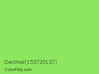 Decimal 153720137 Color is a light green color and the nearest color is Kiwi #8ee53f. Hex code #8de65d and RGB value is rgb(141,230,93). In RGB color space, this color is composed of 55% red, 90% green, 36% blue, In CMYK color space, this color is composed of 39% cyan, 0% magenta, 60% yellow , 10% black , In HSL color space, this color has a hue angle of 99° , 73% saturation and 63% lightness.