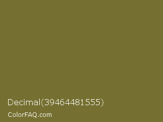 Decimal 39464481555 Color is a normal yellow color and the nearest color is Pesto #7c7631. Hex code #757031 and RGB value is rgb(117,112,49). In RGB color space, this color is composed of 46% red, 44% green, 19% blue, In CMYK color space, this color is composed of 0% cyan, 4% magenta, 58% yellow , 54% black , In HSL color space, this color has a hue angle of 56° , 41% saturation and 33% lightness.