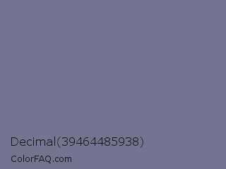 Decimal 39464485938 Color is a normal indigo color and the nearest color is Rhythm #777696. Hex code #757490 and RGB value is rgb(117,116,144). In RGB color space, this color is composed of 46% red, 45% green, 56% blue, In CMYK color space, this color is composed of 19% cyan, 19% magenta, 0% yellow , 44% black , In HSL color space, this color has a hue angle of 242° , 11% saturation and 51% lightness.