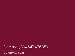 Decimal 39464747635 Color is a dark rose color and the nearest color is Claret #7f1734. Hex code #761031 and RGB value is rgb(118,16,49). In RGB color space, this color is composed of 46% red, 6% green, 19% blue, In CMYK color space, this color is composed of 0% cyan, 86% magenta, 58% yellow , 54% black , In HSL color space, this color has a hue angle of 341° , 76% saturation and 26% lightness.