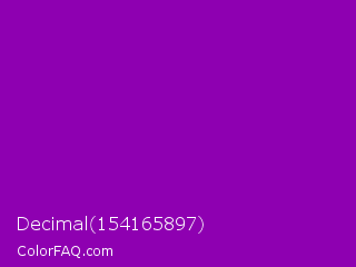 Decimal 154165897 Color is a normal purple color and the nearest color is Violet RYB #8601af. Hex code #8e00b1 and RGB value is rgb(142,0,177). In RGB color space, this color is composed of 56% red, 0% green, 69% blue, In CMYK color space, this color is composed of 20% cyan, 100% magenta, 0% yellow , 31% black , In HSL color space, this color has a hue angle of 288° , 100% saturation and 35% lightness.