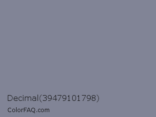 Decimal 39479101798 Color is a normal blue color and the nearest color is Roman Silver #838996. Hex code #818496 and RGB value is rgb(129,132,150). In RGB color space, this color is composed of 51% red, 52% green, 59% blue, In CMYK color space, this color is composed of 14% cyan, 12% magenta, 0% yellow , 41% black , In HSL color space, this color has a hue angle of 231° , 9% saturation and 55% lightness.