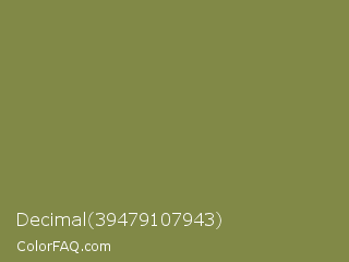Decimal 39479107943 Color is a normal yellow color and the nearest color is Dark Tan #918151. Hex code #818947 and RGB value is rgb(129,137,71). In RGB color space, this color is composed of 51% red, 54% green, 28% blue, In CMYK color space, this color is composed of 6% cyan, 0% magenta, 48% yellow , 46% black , In HSL color space, this color has a hue angle of 67° , 32% saturation and 41% lightness.