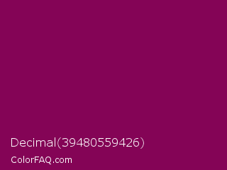 Decimal 39480559426 Color is a dark magenta color and the nearest color is Cardinal Pink #8c055e. Hex code #840456 and RGB value is rgb(132,4,86). In RGB color space, this color is composed of 52% red, 2% green, 34% blue, In CMYK color space, this color is composed of 0% cyan, 97% magenta, 35% yellow , 48% black , In HSL color space, this color has a hue angle of 322° , 94% saturation and 27% lightness.