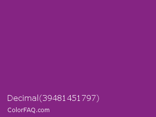 Decimal 39481451797 Color is a normal magenta color and the nearest color is Razzmic Berry Crayola #843179. Hex code #852483 and RGB value is rgb(133,36,131). In RGB color space, this color is composed of 52% red, 14% green, 51% blue, In CMYK color space, this color is composed of 0% cyan, 73% magenta, 2% yellow , 48% black , In HSL color space, this color has a hue angle of 301° , 57% saturation and 33% lightness.