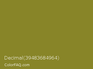 Decimal 39483684964 Color is a normal yellow color and the nearest color is Old Moss Green #867e36. Hex code #888528 and RGB value is rgb(136,133,40). In RGB color space, this color is composed of 53% red, 52% green, 16% blue, In CMYK color space, this color is composed of 0% cyan, 2% magenta, 71% yellow , 47% black , In HSL color space, this color has a hue angle of 58° , 55% saturation and 35% lightness.