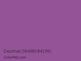 Decimal 39498184199 Color is a normal magenta color and the nearest color is Trendy Pink #8c6495. Hex code #945397 and RGB value is rgb(148,83,151). In RGB color space, this color is composed of 58% red, 33% green, 59% blue, In CMYK color space, this color is composed of 2% cyan, 45% magenta, 0% yellow , 41% black , In HSL color space, this color has a hue angle of 297° , 29% saturation and 46% lightness.