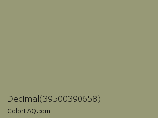 Decimal 39500390658 Color is a normal yellow color and the nearest color is Gurkha #9a9577. Hex code #979976 and RGB value is rgb(151,153,118). In RGB color space, this color is composed of 59% red, 60% green, 46% blue, In CMYK color space, this color is composed of 1% cyan, 0% magenta, 23% yellow , 40% black , In HSL color space, this color has a hue angle of 63° , 15% saturation and 53% lightness.
