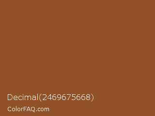 Decimal 2469675668 Color is a normal orange color and the nearest color is Rope #8e4d1e. Hex code #905226 and RGB value is rgb(144,82,38). In RGB color space, this color is composed of 56% red, 32% green, 15% blue, In CMYK color space, this color is composed of 0% cyan, 43% magenta, 74% yellow , 44% black , In HSL color space, this color has a hue angle of 25° , 58% saturation and 36% lightness.