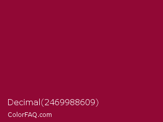 Decimal 2469988609 Color is a dark rose color and the nearest color is Pink Raspberry #980036. Hex code #910835 and RGB value is rgb(145,8,53). In RGB color space, this color is composed of 57% red, 3% green, 21% blue, In CMYK color space, this color is composed of 0% cyan, 94% magenta, 63% yellow , 43% black , In HSL color space, this color has a hue angle of 340° , 90% saturation and 30% lightness.