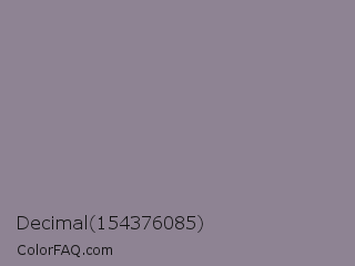 Decimal 154376085 Color is a normal purple color and the nearest color is Mamba #8e8190. Hex code #8e8393 and RGB value is rgb(142,131,147). In RGB color space, this color is composed of 56% red, 51% green, 58% blue, In CMYK color space, this color is composed of 3% cyan, 11% magenta, 0% yellow , 42% black , In HSL color space, this color has a hue angle of 281° , 7% saturation and 55% lightness.