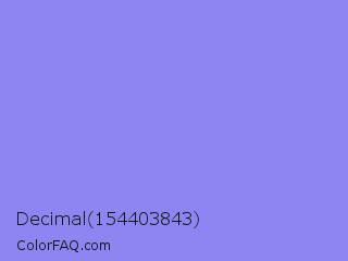 Decimal 154403843 Color is a light indigo color and the nearest color is Portage #8b9fee. Hex code #8e85f3 and RGB value is rgb(142,133,243). In RGB color space, this color is composed of 56% red, 52% green, 95% blue, In CMYK color space, this color is composed of 42% cyan, 45% magenta, 0% yellow , 5% black , In HSL color space, this color has a hue angle of 245° , 82% saturation and 74% lightness.