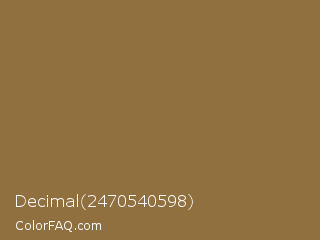 Decimal 2470540598 Color is a normal orange color and the nearest color is French Bistre #856d4d. Hex code #917040 and RGB value is rgb(145,112,64). In RGB color space, this color is composed of 57% red, 44% green, 25% blue, In CMYK color space, this color is composed of 0% cyan, 23% magenta, 56% yellow , 43% black , In HSL color space, this color has a hue angle of 36° , 39% saturation and 41% lightness.