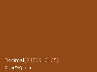 Decimal 2470916165 Color is a normal orange color and the nearest color is Korma #8f4b0e. Hex code #924915 and RGB value is rgb(146,73,21). In RGB color space, this color is composed of 57% red, 29% green, 8% blue, In CMYK color space, this color is composed of 0% cyan, 50% magenta, 86% yellow , 43% black , In HSL color space, this color has a hue angle of 25° , 75% saturation and 33% lightness.
