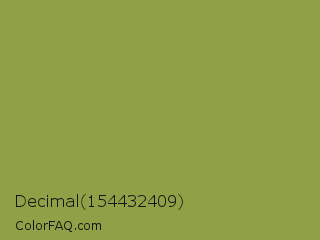 Decimal 154432409 Color is a normal lime color and the nearest color is Sushi #87ab39. Hex code #8ea147 and RGB value is rgb(142,161,71). In RGB color space, this color is composed of 56% red, 63% green, 28% blue, In CMYK color space, this color is composed of 12% cyan, 0% magenta, 56% yellow , 37% black , In HSL color space, this color has a hue angle of 73° , 39% saturation and 45% lightness.