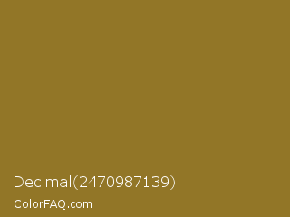 Decimal 2470987139 Color is a normal orange color and the nearest color is Sand Dune #967117. Hex code #927627 and RGB value is rgb(146,118,39). In RGB color space, this color is composed of 57% red, 46% green, 15% blue, In CMYK color space, this color is composed of 0% cyan, 19% magenta, 73% yellow , 43% black , In HSL color space, this color has a hue angle of 44° , 58% saturation and 36% lightness.
