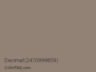 Decimal 2470999859 Color is a normal orange color and the nearest color is Squirrel #8f8176. Hex code #928275 and RGB value is rgb(146,130,117). In RGB color space, this color is composed of 57% red, 51% green, 46% blue, In CMYK color space, this color is composed of 0% cyan, 11% magenta, 20% yellow , 43% black , In HSL color space, this color has a hue angle of 27° , 12% saturation and 52% lightness.
