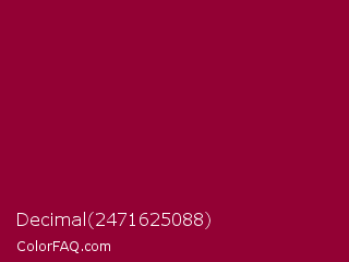 Decimal 2471625088 Color is a dark rose color and the nearest color is Pink Raspberry #980036. Hex code #930134 and RGB value is rgb(147,1,52). In RGB color space, this color is composed of 58% red, 0% green, 20% blue, In CMYK color space, this color is composed of 0% cyan, 99% magenta, 65% yellow , 42% black , In HSL color space, this color has a hue angle of 339° , 99% saturation and 29% lightness.