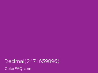 Decimal 2471659896 Color is a normal magenta color and the nearest color is Violet Eggplant #991199. Hex code #932392 and RGB value is rgb(147,35,146). In RGB color space, this color is composed of 58% red, 14% green, 57% blue, In CMYK color space, this color is composed of 0% cyan, 76% magenta, 1% yellow , 42% black , In HSL color space, this color has a hue angle of 301° , 62% saturation and 36% lightness.