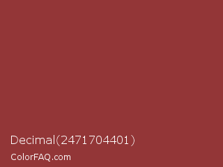 Decimal 2471704401 Color is a normal red color and the nearest color is Sanguine Brown #8d3d38. Hex code #933637 and RGB value is rgb(147,54,55). In RGB color space, this color is composed of 58% red, 21% green, 22% blue, In CMYK color space, this color is composed of 0% cyan, 63% magenta, 63% yellow , 42% black , In HSL color space, this color has a hue angle of 359° , 46% saturation and 39% lightness.