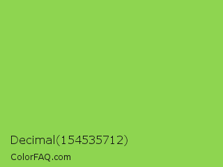 Decimal 154535712 Color is a normal green color and the nearest color is Kiwi #8ee53f. Hex code #8ed550 and RGB value is rgb(142,213,80). In RGB color space, this color is composed of 56% red, 84% green, 31% blue, In CMYK color space, this color is composed of 33% cyan, 0% magenta, 62% yellow , 16% black , In HSL color space, this color has a hue angle of 92° , 61% saturation and 57% lightness.