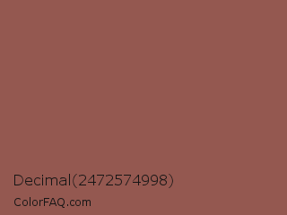 Decimal 2472574998 Color is a normal red color and the nearest color is Spicy Mix #8b5f4d. Hex code #945850 and RGB value is rgb(148,88,80). In RGB color space, this color is composed of 58% red, 35% green, 31% blue, In CMYK color space, this color is composed of 0% cyan, 41% magenta, 46% yellow , 42% black , In HSL color space, this color has a hue angle of 7° , 30% saturation and 45% lightness.