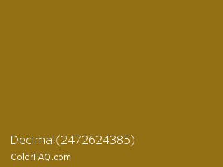 Decimal 2472624385 Color is a normal orange color and the nearest color is Sand Dune #967117. Hex code #947015 and RGB value is rgb(148,112,21). In RGB color space, this color is composed of 58% red, 44% green, 8% blue, In CMYK color space, this color is composed of 0% cyan, 24% magenta, 86% yellow , 42% black , In HSL color space, this color has a hue angle of 43° , 75% saturation and 33% lightness.