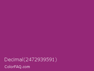 Decimal 2472939591 Color is a normal magenta color and the nearest color is Amaranth Deep Purple #9f2b68. Hex code #952777 and RGB value is rgb(149,39,119). In RGB color space, this color is composed of 58% red, 15% green, 47% blue, In CMYK color space, this color is composed of 0% cyan, 74% magenta, 20% yellow , 42% black , In HSL color space, this color has a hue angle of 316° , 59% saturation and 37% lightness.