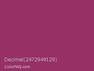 Decimal 2472949129 Color is a normal rose color and the nearest color is Amaranth Deep Purple #9f2b68. Hex code #953165 and RGB value is rgb(149,49,101). In RGB color space, this color is composed of 58% red, 19% green, 40% blue, In CMYK color space, this color is composed of 0% cyan, 67% magenta, 32% yellow , 42% black , In HSL color space, this color has a hue angle of 329° , 51% saturation and 39% lightness.