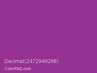 Decimal 2472949298 Color is a normal magenta color and the nearest color is Vivid Violet #803790. Hex code #953190 and RGB value is rgb(149,49,144). In RGB color space, this color is composed of 58% red, 19% green, 56% blue, In CMYK color space, this color is composed of 0% cyan, 67% magenta, 3% yellow , 42% black , In HSL color space, this color has a hue angle of 303° , 51% saturation and 39% lightness.