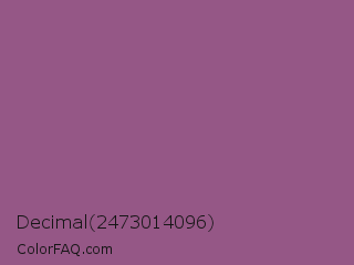 Decimal 2473014096 Color is a normal magenta color and the nearest color is Antique Fuchsia #915c83. Hex code #955786 and RGB value is rgb(149,87,134). In RGB color space, this color is composed of 58% red, 34% green, 53% blue, In CMYK color space, this color is composed of 0% cyan, 42% magenta, 10% yellow , 42% black , In HSL color space, this color has a hue angle of 315° , 26% saturation and 46% lightness.