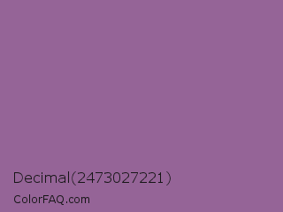 Decimal 2473027221 Color is a normal magenta color and the nearest color is Trendy Pink #8c6495. Hex code #956497 and RGB value is rgb(149,100,151). In RGB color space, this color is composed of 58% red, 39% green, 59% blue, In CMYK color space, this color is composed of 1% cyan, 34% magenta, 0% yellow , 41% black , In HSL color space, this color has a hue angle of 298° , 20% saturation and 49% lightness.
