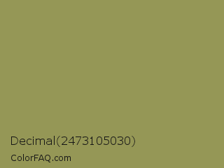 Decimal 2473105030 Color is a normal yellow color and the nearest color is Moss Green #8a9a5b. Hex code #959756 and RGB value is rgb(149,151,86). In RGB color space, this color is composed of 58% red, 59% green, 34% blue, In CMYK color space, this color is composed of 1% cyan, 0% magenta, 43% yellow , 41% black , In HSL color space, this color has a hue angle of 62° , 27% saturation and 46% lightness.
