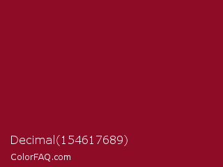 Decimal 154617689 Color is a dark red color and the nearest color is Monarch #8b0723. Hex code #8f0c27 and RGB value is rgb(143,12,39). In RGB color space, this color is composed of 56% red, 5% green, 15% blue, In CMYK color space, this color is composed of 0% cyan, 92% magenta, 73% yellow , 44% black , In HSL color space, this color has a hue angle of 348° , 85% saturation and 30% lightness.
