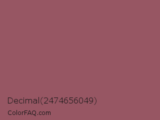 Decimal 2474656049 Color is a normal red color and the nearest color is Rose Taupe #905d5d. Hex code #975663 and RGB value is rgb(151,86,99). In RGB color space, this color is composed of 59% red, 34% green, 39% blue, In CMYK color space, this color is composed of 0% cyan, 43% magenta, 34% yellow , 41% black , In HSL color space, this color has a hue angle of 348° , 27% saturation and 46% lightness.
