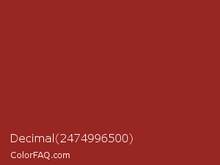 Decimal 2474996500 Color is a normal red color and the nearest color is Vivid Auburn #922724. Hex code #982622 and RGB value is rgb(152,38,34). In RGB color space, this color is composed of 60% red, 15% green, 13% blue, In CMYK color space, this color is composed of 0% cyan, 75% magenta, 78% yellow , 40% black , In HSL color space, this color has a hue angle of 2° , 63% saturation and 36% lightness.