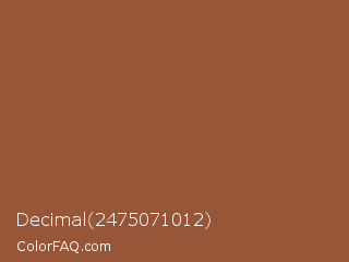 Decimal 2475071012 Color is a normal orange color and the nearest color is Coconut #965a3e. Hex code #985638 and RGB value is rgb(152,86,56). In RGB color space, this color is composed of 60% red, 34% green, 22% blue, In CMYK color space, this color is composed of 0% cyan, 43% magenta, 63% yellow , 40% black , In HSL color space, this color has a hue angle of 19° , 46% saturation and 41% lightness.