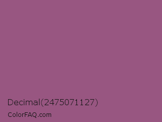Decimal 2475071127 Color is a normal magenta color and the nearest color is Antique Fuchsia #915c83. Hex code #985681 and RGB value is rgb(152,86,129). In RGB color space, this color is composed of 60% red, 34% green, 51% blue, In CMYK color space, this color is composed of 0% cyan, 43% magenta, 15% yellow , 40% black , In HSL color space, this color has a hue angle of 321° , 28% saturation and 47% lightness.