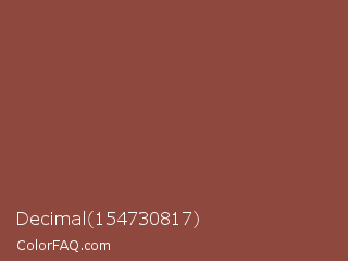 Decimal 154730817 Color is a normal red color and the nearest color is Ironstone #86483c. Hex code #8f483d and RGB value is rgb(143,72,61). In RGB color space, this color is composed of 56% red, 28% green, 24% blue, In CMYK color space, this color is composed of 0% cyan, 50% magenta, 57% yellow , 44% black , In HSL color space, this color has a hue angle of 8° , 40% saturation and 40% lightness.