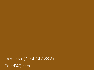 Decimal 154747282 Color is a normal orange color and the nearest color is Grizzly #885818. Hex code #8f5810 and RGB value is rgb(143,88,16). In RGB color space, this color is composed of 56% red, 35% green, 6% blue, In CMYK color space, this color is composed of 0% cyan, 38% magenta, 89% yellow , 44% black , In HSL color space, this color has a hue angle of 34° , 80% saturation and 31% lightness.
